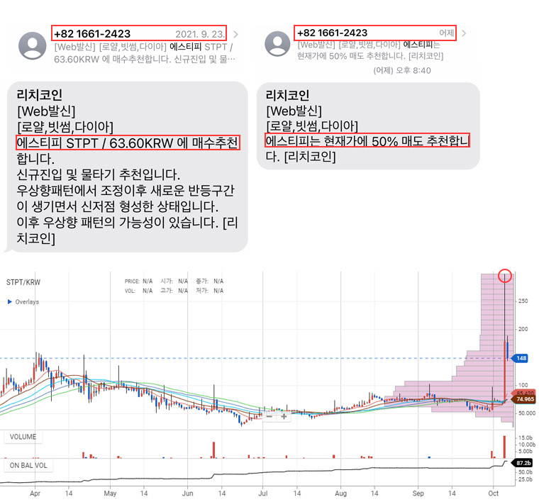 에스티피 370.12% 수익 축하드립니다.(추천문자사진 첨부)-추가매도