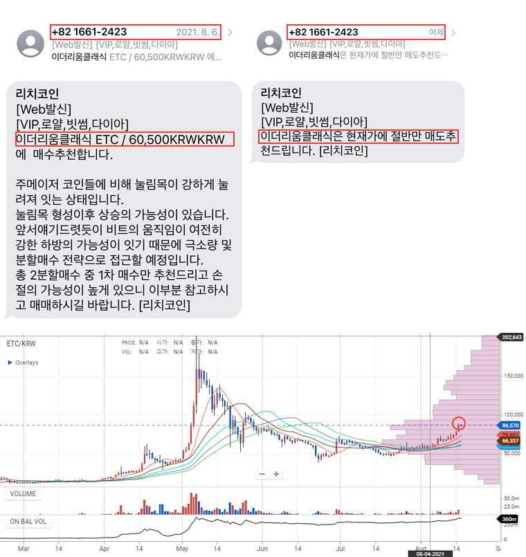 이더리움클래식 47.70% 수익 축하드립니다.(추천문자사진 첨부)-절반매도
